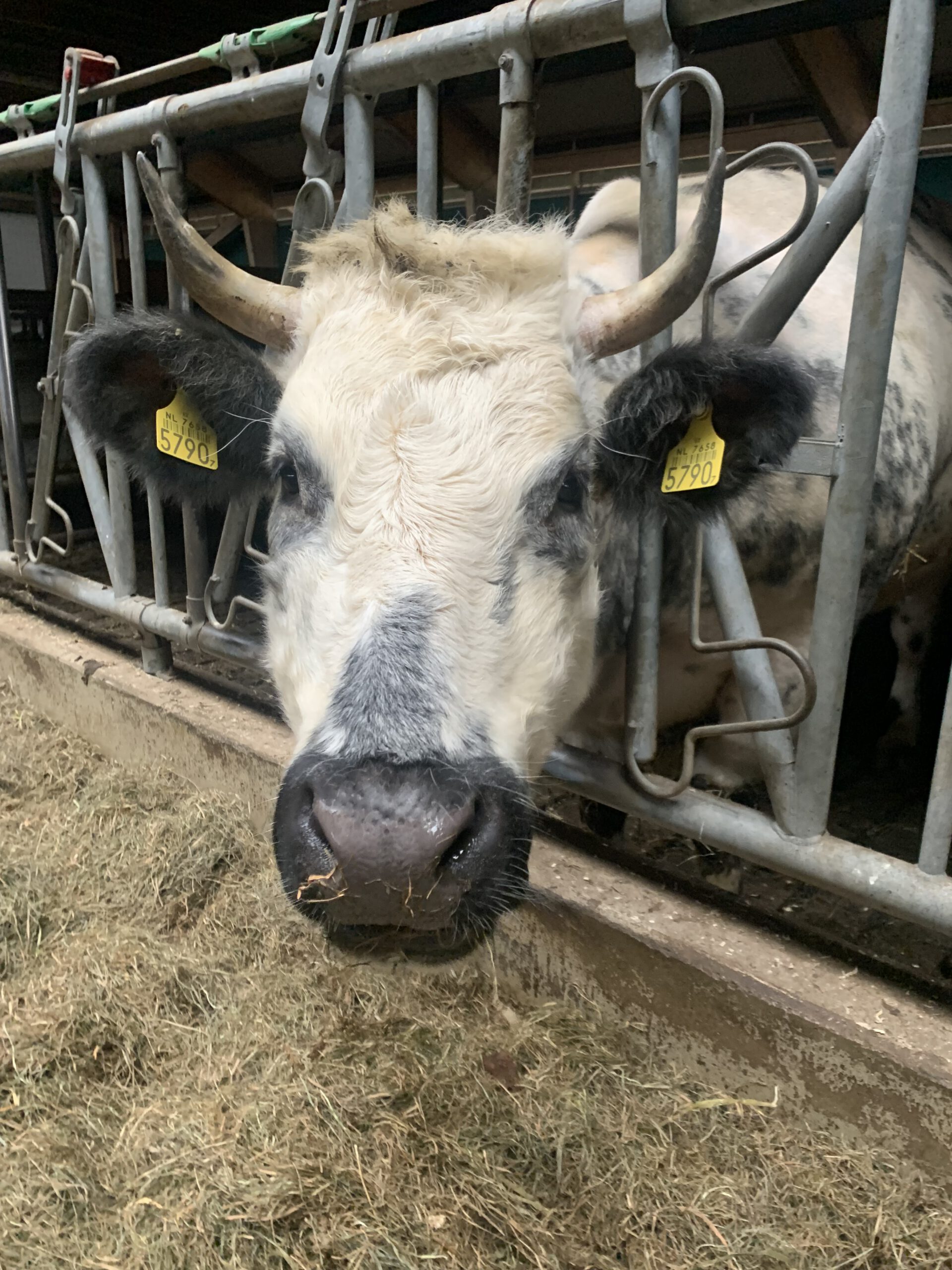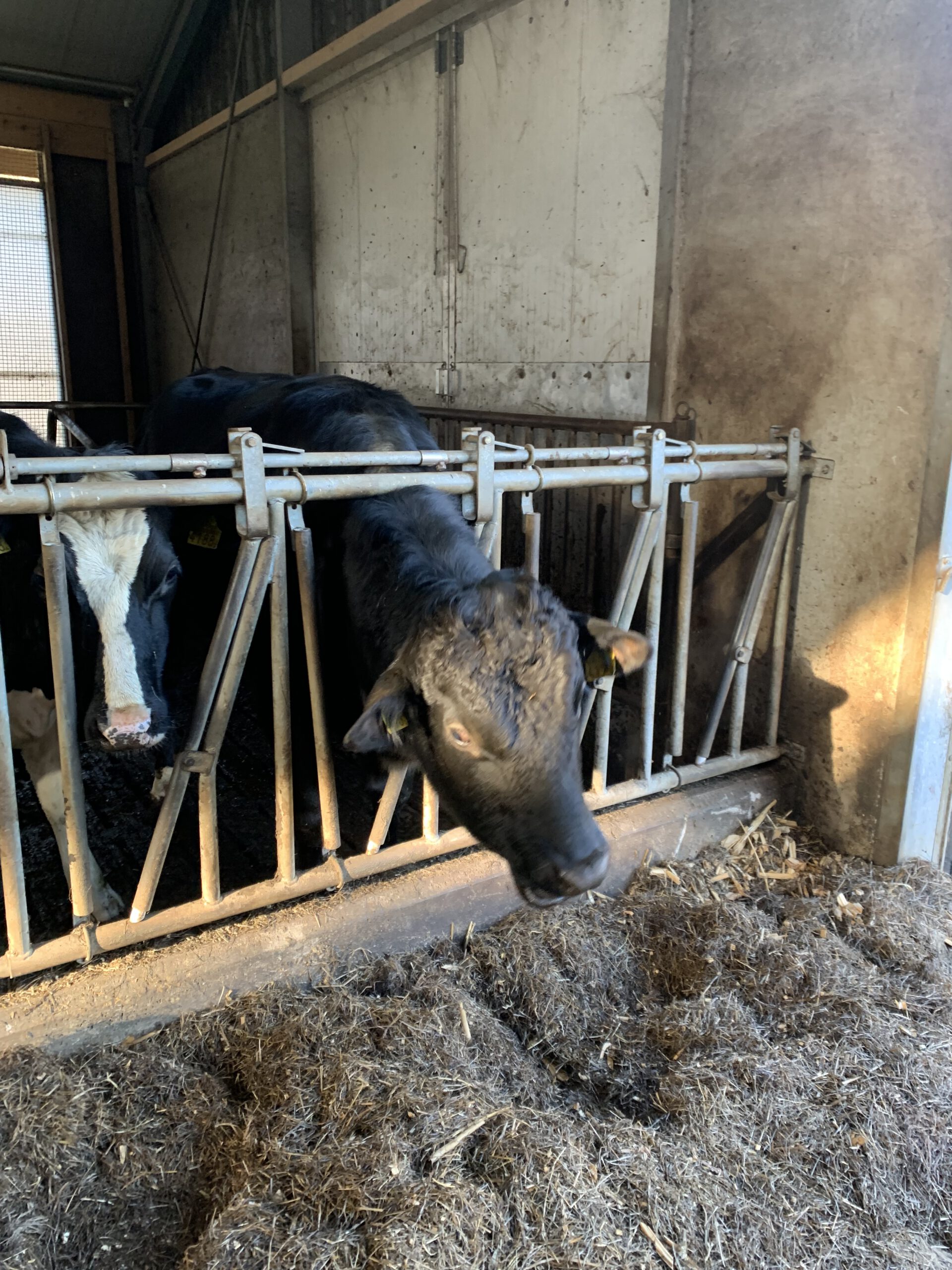 [11:35] We worden gelijk verwelkomd door de boerderijhond. Dan lopen we het erf op, waar we het deurtje zien richting de kaaswinkel. Het winkeltje is erg klein, maar er is genoeg kaas te vinden! Naast kazen hebben ze ook nog andere streekproducten zoals: honing, vruchtensiropen, vlees, yoghurt, melk, jam en nog meer lekkers. Max, mijn vriend, is gek op kaas (ik niet zo haha) dus hij neemt een babykaasje mee. Wanneer we weer buiten zijn, zien we een koe! De koe wordt gemolken door de boer; erg interessant om te zien.