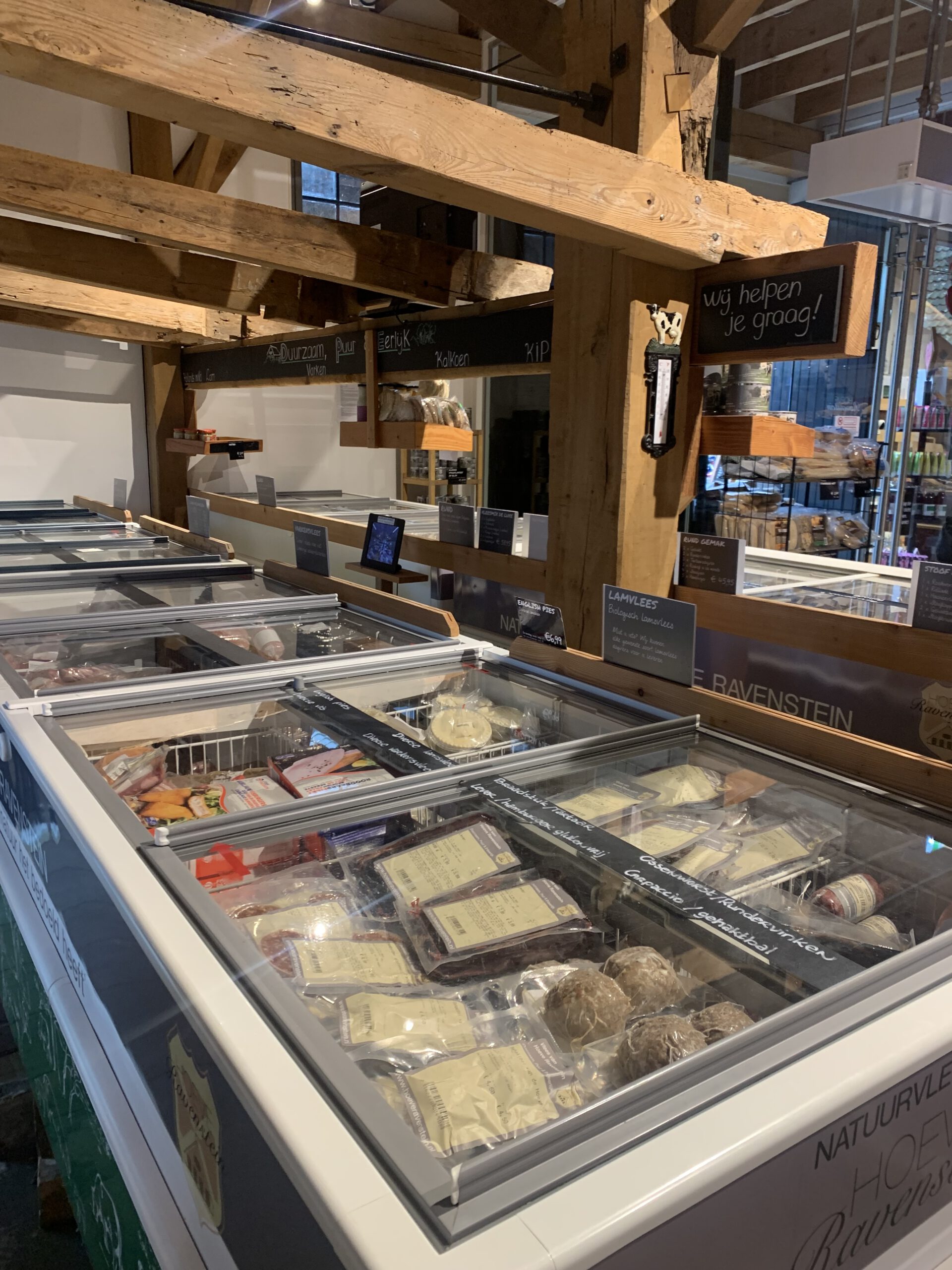 [12:15] We parkeren de auto en lopen het terrein op. Wat is het groot hier! Hoeve Ravenstein is verdeeld in vijf ruimtes: de stal, de boerderijwinkel, de groentekas, het café en een zitruimte. Genoeg te zien dus! We beginnen in de stal waar we allemaal koeien zien. Maar ze hebben niet alleen koeien maar ook cavia’s, konijnen, geiten, eenden, een ezel, kalkoenen én kippen. Een heuse boerderij kun je het dus wel noemen! Je kunt hier gemakkelijk een hele middag vertoeven. Wij kiezen ervoor om even wat te drinken en een gebakje te eten uit het café. Wauw, wat is er veel keuze zeg… ik denk dat ze wel tien soorten koeken hebben, maar ook taarten en ander vers gebak. Alles is huisgemaakt, kijk daar houden we van! Na lang twijfelen zijn we eruit: een verse muntthee, een zwarte koffie, een chocoladetaart met een mouse-vulling en een nog warme rozijnenstrüdel. Heerlijk! We nemen hierna nog een kijkje in de winkel. We worden verrast door de vele vriezers met vlees uit eigen veehouderij. Dit is het trots van de hoeve. Ze boeren al decennialang op een natuur- en diervriendelijke manier, met oog voor de toekomst en maximaal dierenwelzijn (meer hierover is te lezen op hun website). Erg mooi om vlees te zien waarvan je de herkomst weet en het verhaal, dat maakt het betrouwbaar. Hier komen wij nog een keer voor terug als we geen andere stops meer op de planning hebben!