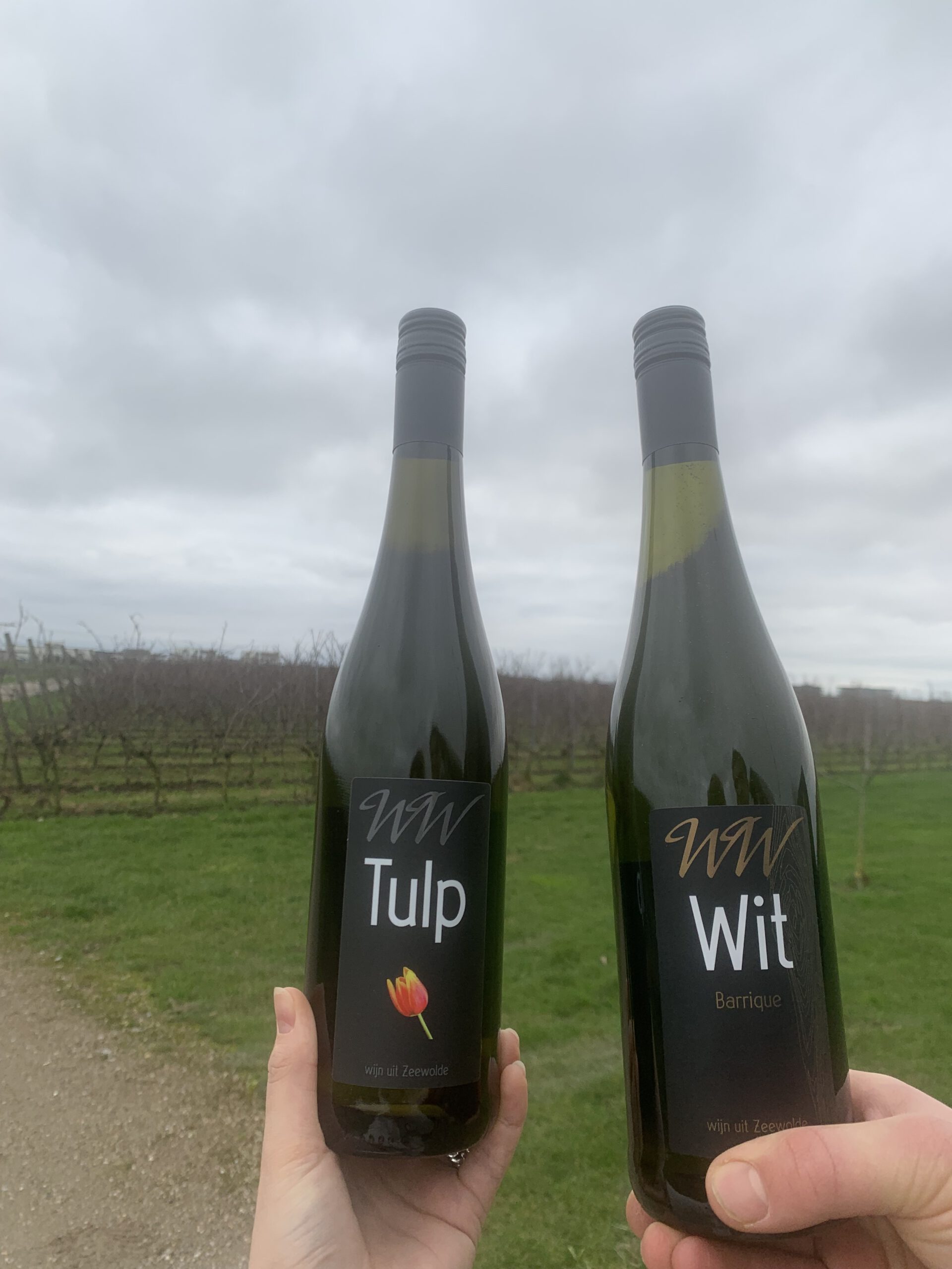 [14:40] We rijden een heel stuk door de vlakte. Je kunt ver kijken door de grote stukken weiland. En dan aan onze linkerhand staat een bord: ‘Wijngaard Wilgenhorst’, we zijn er! We zien gelijk de olijftakken staan, helemaal kaal, want het is winter en het plukseizoen is geweest in oktober. We rijden iets verder en daar staat een groot modern huis. Links en rechts van het huis is: helemaal niks. We stappen uit de auto en je voelt de frisse wind gelijk tegen je huid aan. Dan lopen we naar binnen, hmm.. hebben ze hier wel wijn te koop? Ja! Rechts zien we een balie staan waar we een meneer treffen. Achter hem staan een aantal flessen wijn. Hij heeft drie soorten wit, één zoete witte wijn, een bubbel en een fles rood. We nemen twee flesjes mee: ‘Wit’ en ‘Tulp’, twee soorten witte droge wijnen.