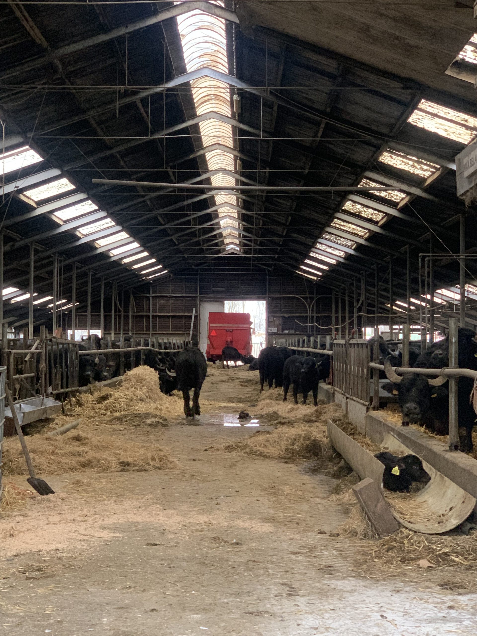 [14:50] We worden verwelkomd door twee honden. Dan zien we de stal met allemaal zwarte buffels! Gaaf gezicht om deze waterbuffels hier te zien zeg… Naast de stal is een ruimte waar we het volgende treffen: een boederijautomaat met buffelmozzarella, buffelburrata, en bufaletta (soort feta). Dan een koelkast gevuld met buffelvla en buffelyoghurt, een kleine vriezer met buffelijs en een grote vriezer met divers buffelvlees. Tot slot een melktap en een kast vol een streekproducten. Zoveel producten van de buffel! Als ik een restaurant zou hebben had ik het wel geweten! The Buffel Company is vorig jaar geopend, gloednieuw dus en neem zeker een kijkje zou ik zeggen!