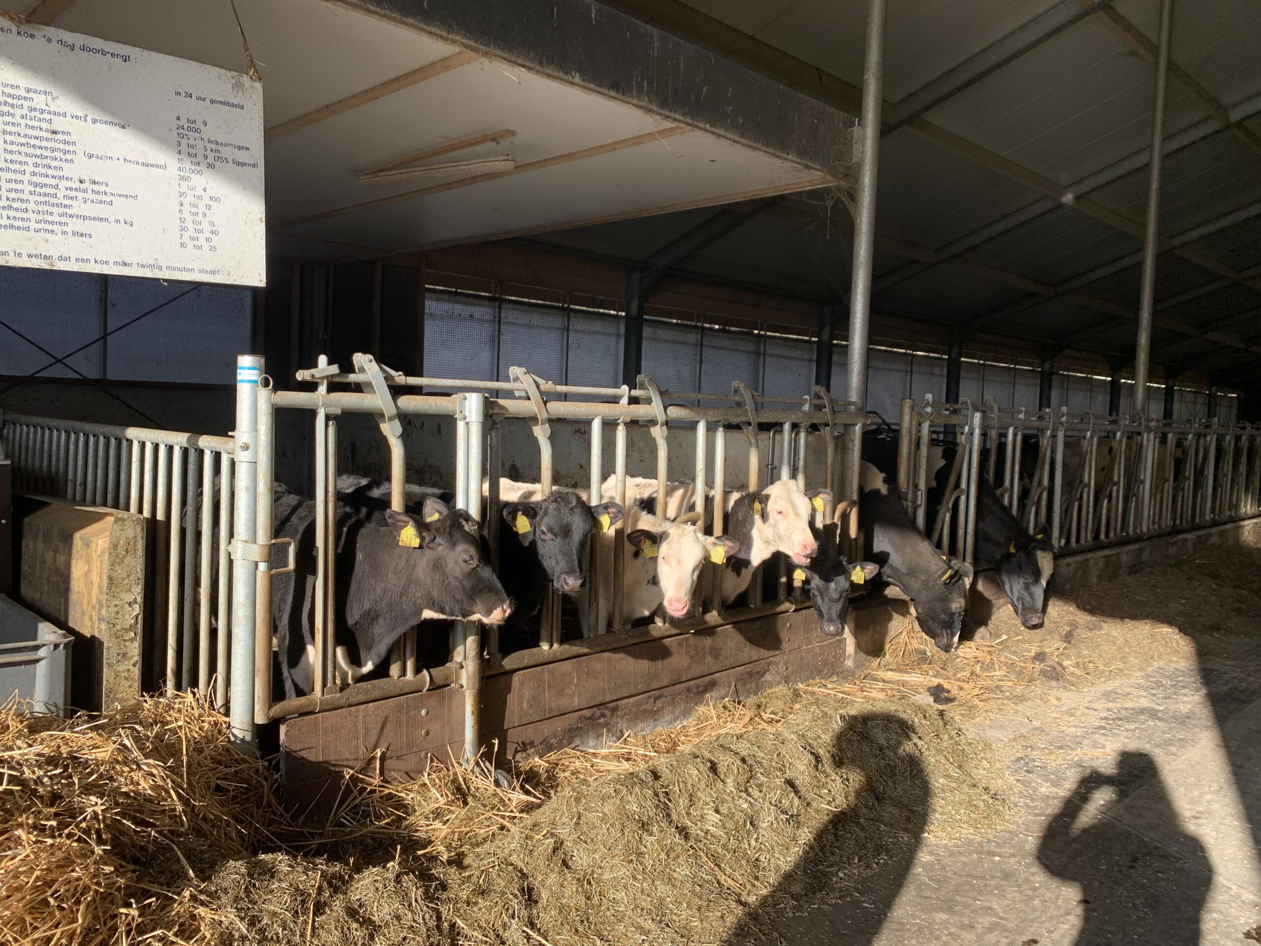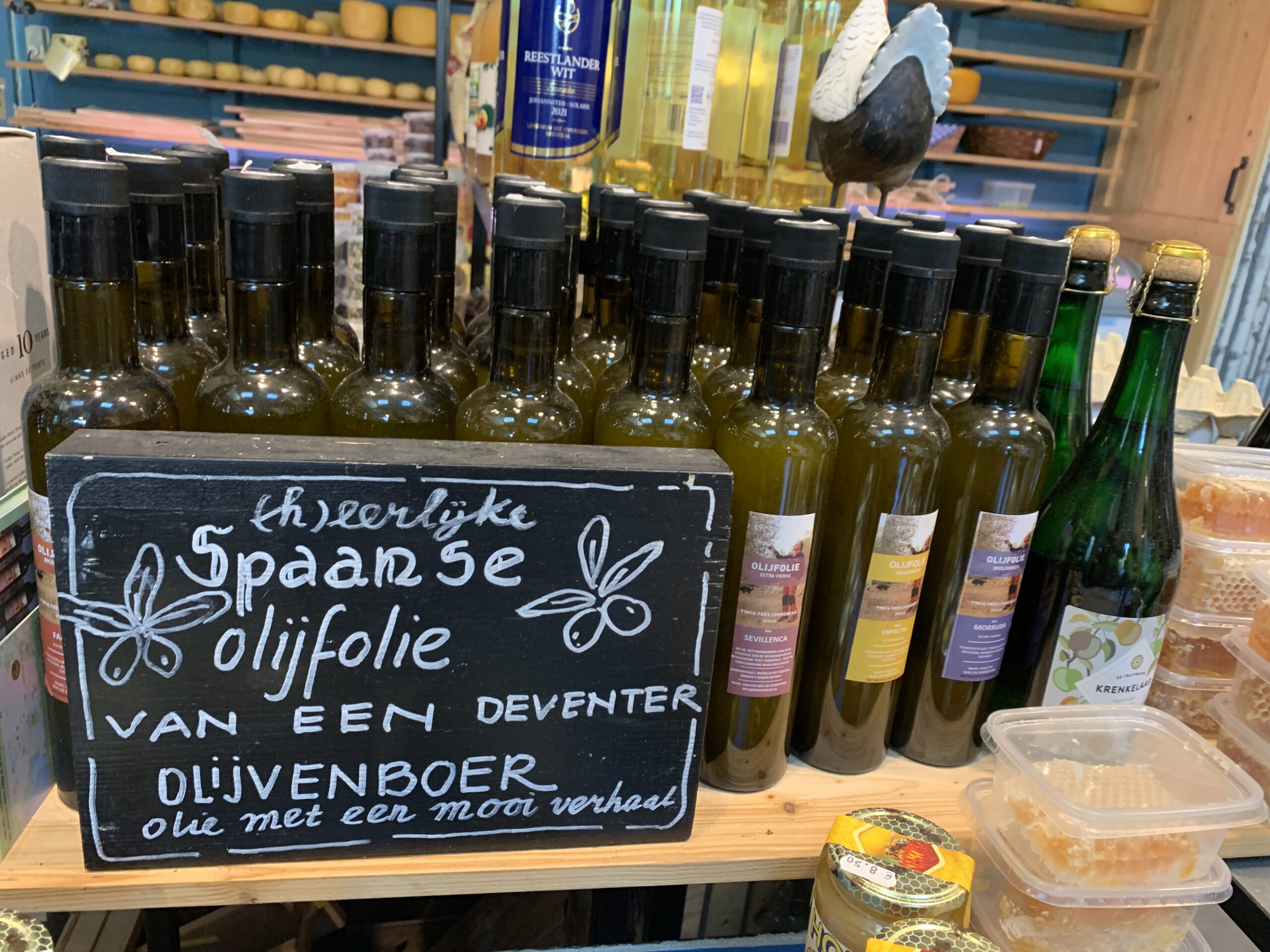 [Za-12:00] Voor we het weten toeren we weer door. We rijden door een verlaten landschap. Het enige wat hier is, is weiland met af en toe een groot huis. Mijn gedachten dwalen af: hoe zou het zijn om een halfuur te moeten fietsen naar de dichtstbijzijnde supermarkt? Even later zien we een groep paarden met daarachter: de boerderij. Wat groot hier! We lopen een enorme stal binnen en we zien een aantal kalfjes, zo schattig! Na een kwartier alle koeien bewonderd te hebben, lopen we verder naar de boerderijwinkel. Hé, daar is iemand kaas aan het maken, de kaasmaker merkt ons op en zwaait naar ons. Dan lopen we het gebouw binnen. Wat geinig, er is hier ook een kunstexpositie. Daarnaast zien we van alles: planken met kaas, yoghurt, jam, vlees in de vriezer en olijfolie. Ik ben gelijk gefascineerd door de olijfolie. Er staan vier soorten olijfolies van hetzelfde merk: ‘Finca tres chimeneas’. Het is olijfolie van een Nederlandse meneer: Marc van Eyk. Hij heeft sinds 2013 een olijfboomgaard in Zuid-Catalonië, Spanje. De olijfolie wordt biologisch geteeld en heeft een Nederlands tintje. Ik neem een flesje ‘Farga’ mee, dit is olijfolie gemaakt van een zeldzaam oud ras met kleine olijven. Ik ben erg benieuwd, hier ga ik zeker nog een blog over schrijven. Max koopt een stuk Wagyu, dit vlees komt van eigen boerderij! Hier wil hij vanavond een gerecht mee maken… Wat een luxe!